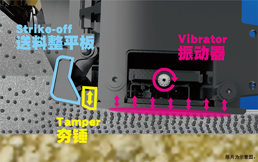 熨平板采用送料整平板+夯錘+振動器組合的住友技術夯實系統。位于前方的送料整平板在對材料進行排列和預壓實的同時,把排列好的材料順暢地輸送至夯錘和振動器,從而實現高壓實度和高平坦性的高質量攤鋪。