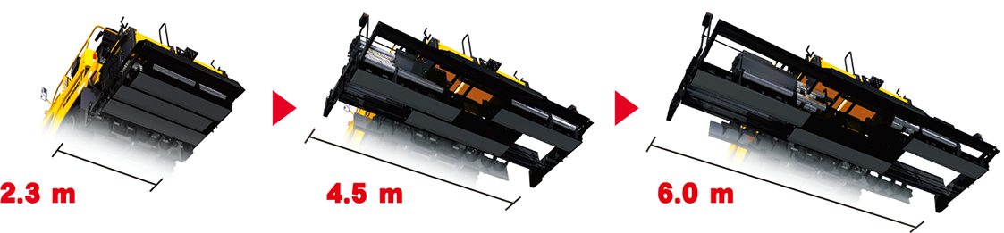 杰平霸熨平板采用住友技術的三聯伸縮式熨平板,可在2.3~6m之間自由伸縮。攤鋪寬幅可一鍵式調節,可實現高精度施工。新構造的高剛性熨平板降低了扭曲變形程度,實現了更為優秀的攤鋪品質。