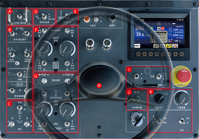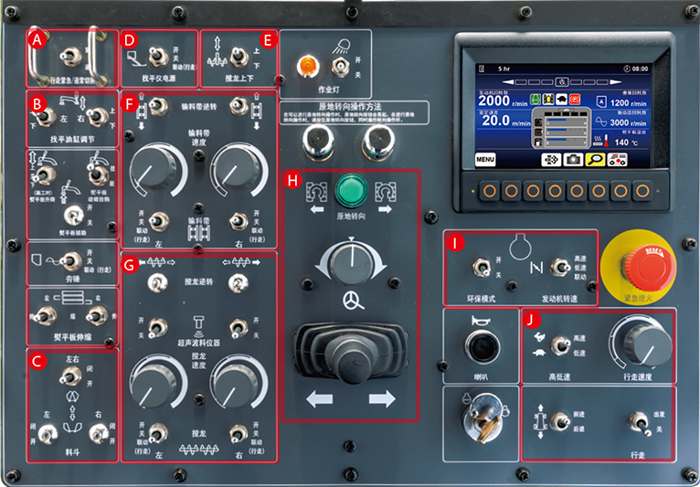 全新設計的操作臺上配置了全彩色的主顯示屏,追求更舒適的操作性。即使萬一熨平板邊控盒集中控制出現故障時,也可通過駕駛臺的操作面板進行操作。