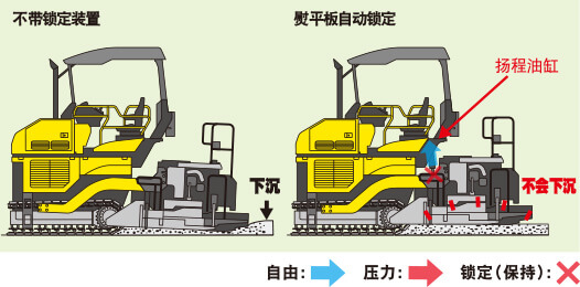 在等待成品材料或攤鋪作業一時停止時,自動鎖定裝置起作用,揚程油缸自動防止熨平板下落。當攤鋪作業恢復時,通過電腦控制柔軟推進功能自動發揮作用。
