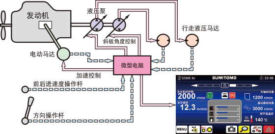 中央控制器同時控制發動機,液壓泵和行走馬達。通過電腦控制和簡單操作實現平穩行走。由于保存已設定內容,只需打開/關閉行走按鈕就能正常進行施工。