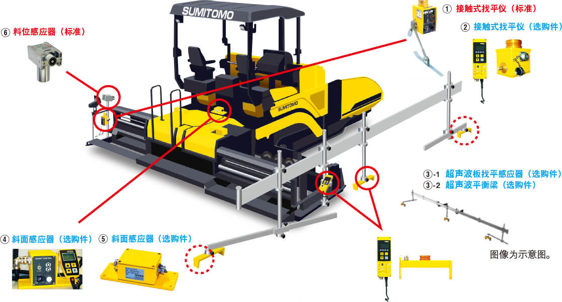 杰平霸2875標準裝備AGC感應器(接觸式找平儀)和超聲波合材流量控制儀,實現了高精度攤鋪質量。還備有其它各種找平儀和斜面感應器等作為選購件。