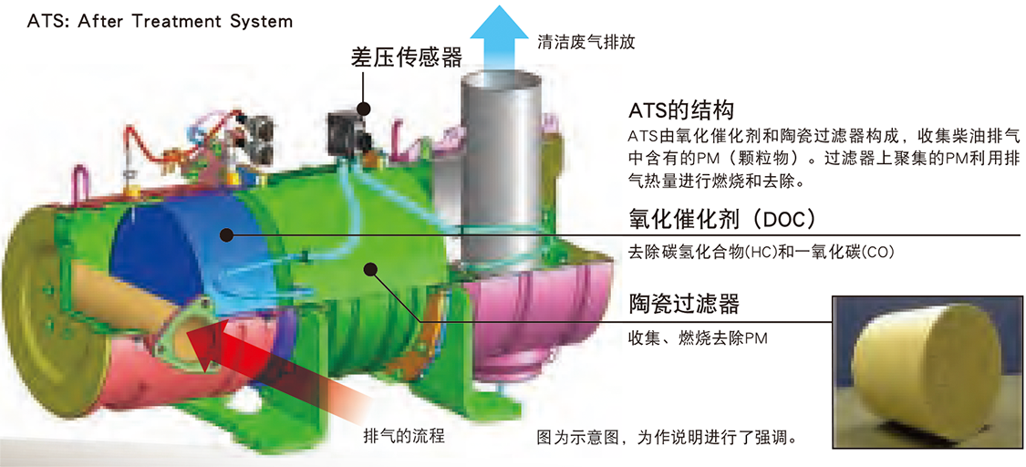 新采用ATS(排氣后處理裝置)對廢氣中的PM(顆粒物)進行收集,燃燒去除并進行后處理。PM聚集后由過濾器清潔控制自動開始燃燒等,追求出色的實用性。