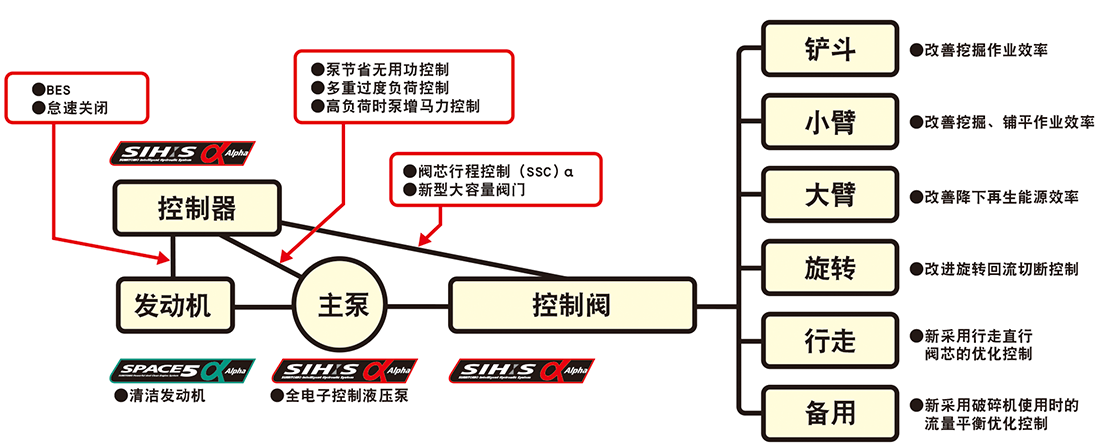 與細致的液壓傳感技術相融合,實現配合作業的精細流量控制。為提高速度、操作性、降低油耗做出貢獻。