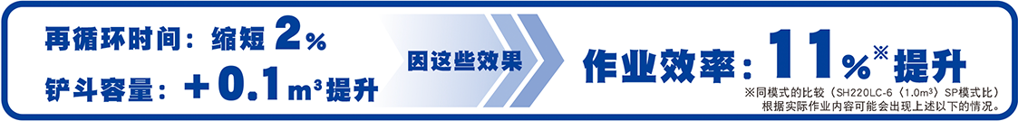 挖掘翻斗累計的作業時間,與現行SH220LC-6相比實現大幅速度提升。同時在有必要進行微操作時,操作性的控制更為優越,大土量與操作性并存。