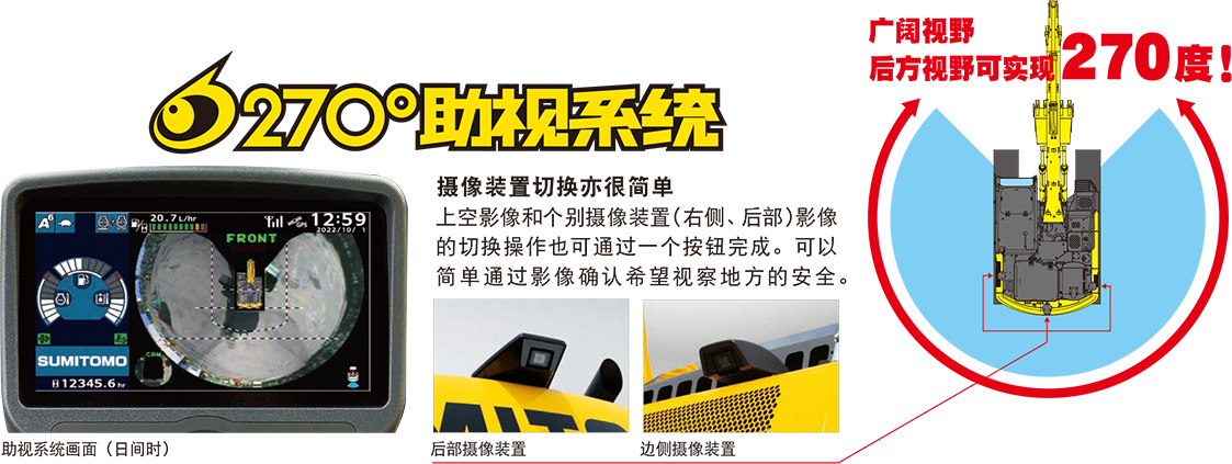 顯示屏是住友建機特制的可選配的270°助視系統。后方視野270度。駕駛員的安全確認非常容易,現場安全可進一步用人眼進行確保。另外攝像頭可進行切換,顯示屏畫面夜間亦能清晰可見。