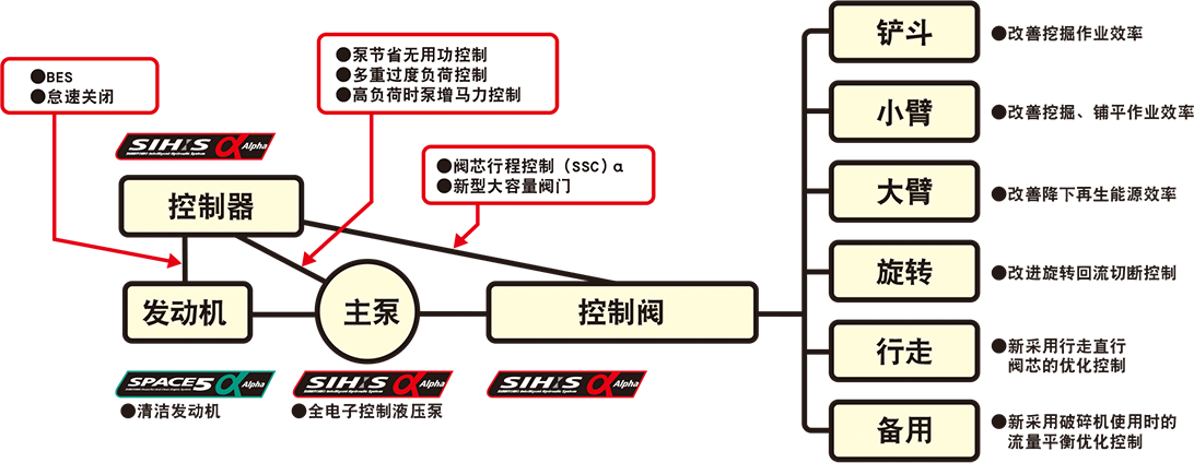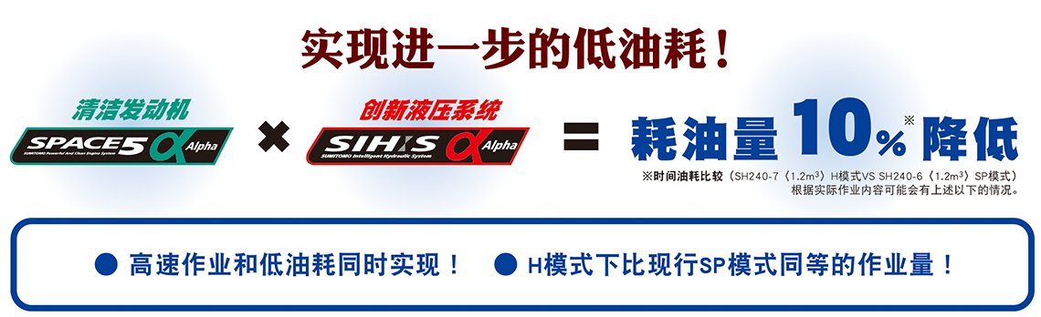 先進的清潔發動機“SPACE 5α”與住友建機的特制液壓系統“SIH:S α”同時兼顧工作效率和出色的耗油性能。而且追求對現場和環境的更加友好。