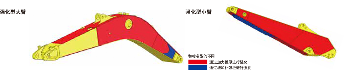 支撐作業的大臂和小臂,進行了高負荷部形狀和結構板的優化,進一步追求強度與耐久性。另外也加強了大臂和小臂連接部的耐久性。