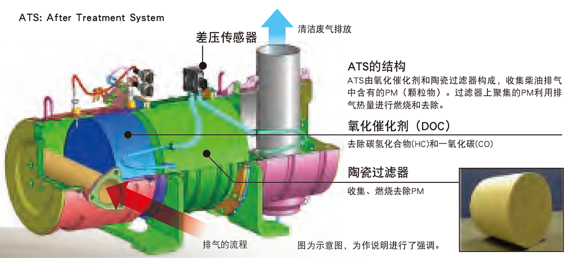 新采用ATS(排氣后處理裝置)對廢氣中的PM(顆粒物)進行收集,燃燒去除并進行后處理。PM聚集后由過濾器清潔控制自動開始燃燒等,追求出色的實用性。