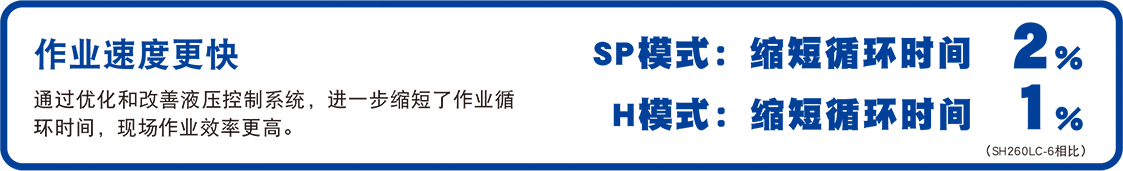挖掘翻斗累計的作業時間,與現行SH260LC-6相比實現大幅速度提升。同時在有必要進行微操作時,操作性的控制更為優越,大土量與操作性并存。