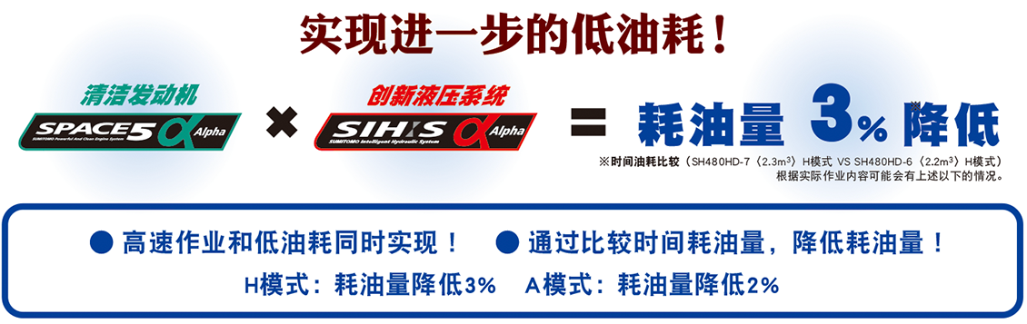 先進的清潔發動機“SPACE 5α”與住友建機的特制液壓系統“SIH:S α”同時兼顧工作效率和出色的耗油性能。而且追求對現場和環境的更加友好。