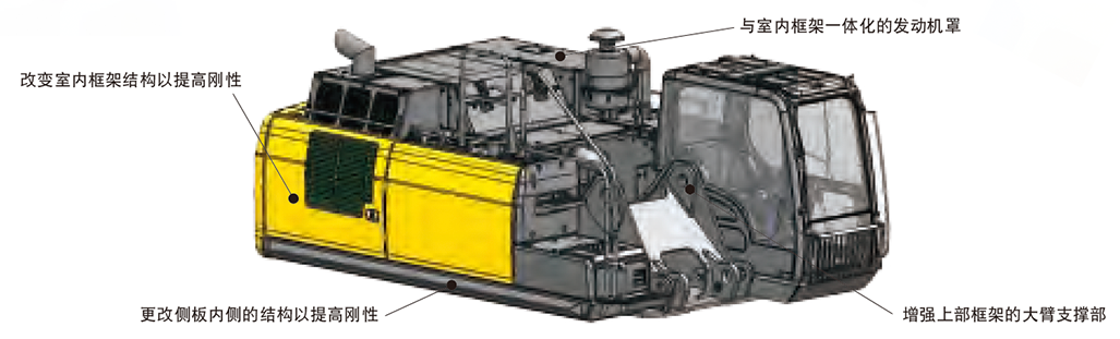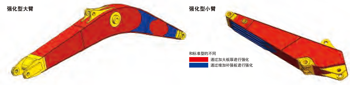 支持作業的大臂和小臂,進行了在高負荷部的板厚加大等以及構造的變更,采用進一步追求強度與耐久性的加強型。另外也加強了連接部的信賴性。