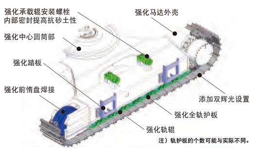 軌輥和前惰輪的改良提高了底盤的耐久性。另外,內部密封性的提升也提高了抗砂土性。