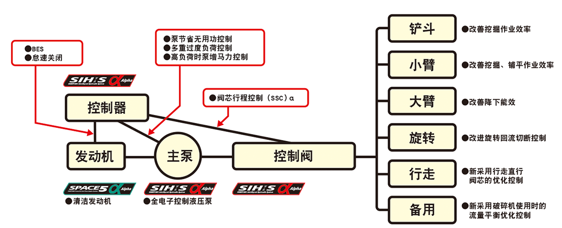 與細致的液壓傳感技術相融合,實現配合作業的精細流量控制。為提高速度、操作性、降低油耗做出貢獻。