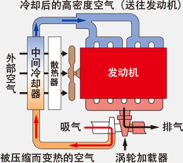 吸入的空氣在渦輪加載器的壓縮下形成高溫,經中間冷卻器冷卻后可提高吸入效率。在大幅度減少NOx和PM的同時,提高了輸出功率,減少了油耗。