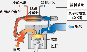 采用冷卻式EGR系統,獲得進一步減少NOx(氮氧化合物)的效果。其做法是在對排放的氣體再循環以降低燃燒溫度的EGR(Exhaust Gas Recircu-lation)上設置水冷式冷卻器。