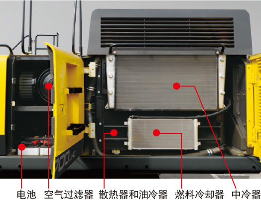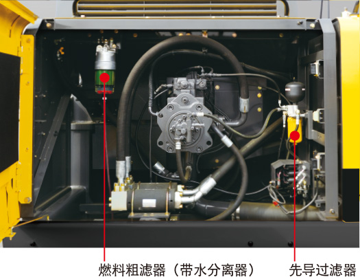 通過對燃料粗濾器的標配,減少了由于燃料阻塞引發的故障。另外,將燃料和油濾設置于在地面可觸及的位置,使更換更加方便。