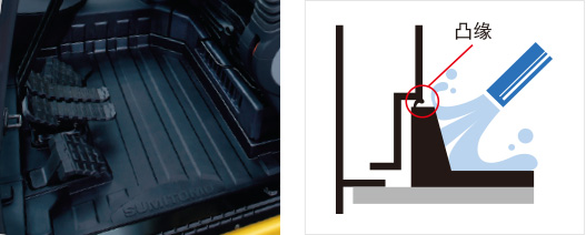 加高了地板柵格的突起,并且新設了凸緣,可以對易臟的駕駛室地板進行水洗。