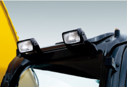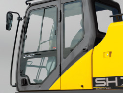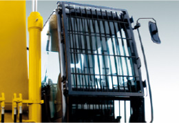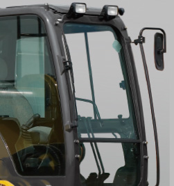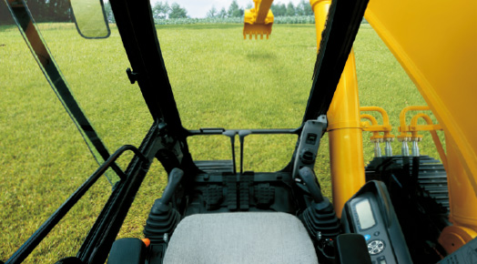 除前面窗戶的大型化以外、側柱變細、更加確保了廣闊的前方視野。另外、在采用了右下窗的同時提高了上方的視野、提高了作業的安全性。